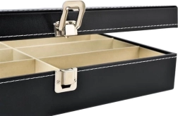 En el interior encontrarás 8 compartimentos independientes con separadores más altos que evitan el contacto accidental y los daños. El suave forro de franela protege contra rozaduras, la práctica cinta mantiene la tapa en la posición ideal y el cierre metálico de presión garantiza un cierre seguro durante el traslado.