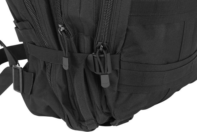 Mochila táctica negra versátil con capacidad de 38L, ideal para actividades al aire libre y uso diario. Fabricada con material resistente e impermeable, ofrece numerosos compartimentos y sistemas que aumentan la comodidad y la funcionalidad.