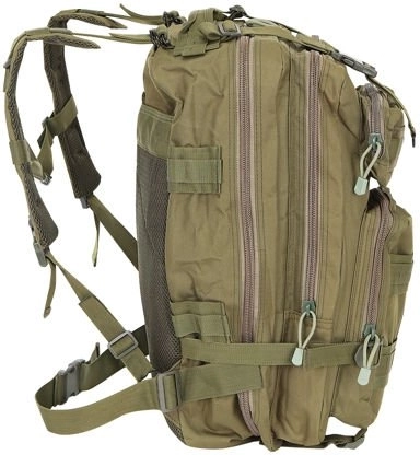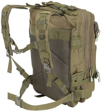La mochila está equipada con bandas PALS para el sistema MOLLE, para colocar equipamiento adicional. La regulación completa permite ajustar el contorno de la mochila mediante correas regulables, adecuadas para transportar, por ejemplo, una esterilla o una tienda.