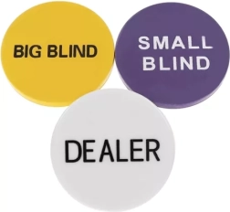 Las fichas DEALER, SMALL BLIND y BIG BLIND garantizan rondas claras y el desarrollo fluido de cada partida.