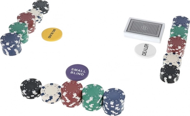 El paquete incluye también fichas funcionales DEALER, SMALL BLIND y BIG BLIND para una organización clara del juego, 2× 54 cartas para una rotación fluida de barajas y 5 dados para más diversión de mesa. El set es ideal para salas de juego en casa, fiestas y competiciones entre amigos.
