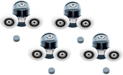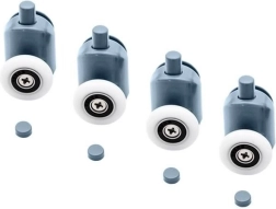 Sustituye los carriles desgastados o que se atascan y recupera la apertura de las puertas de ducha suave y segura. El juego incluye ruedas superiores dobles y ruedas inferiores simples con liberación abatible para facilitar el mantenimiento y la limpieza. La construcción universal con rodamientos de bolas se adapta a la forma de la guía e impide que la puerta se salga del carril.