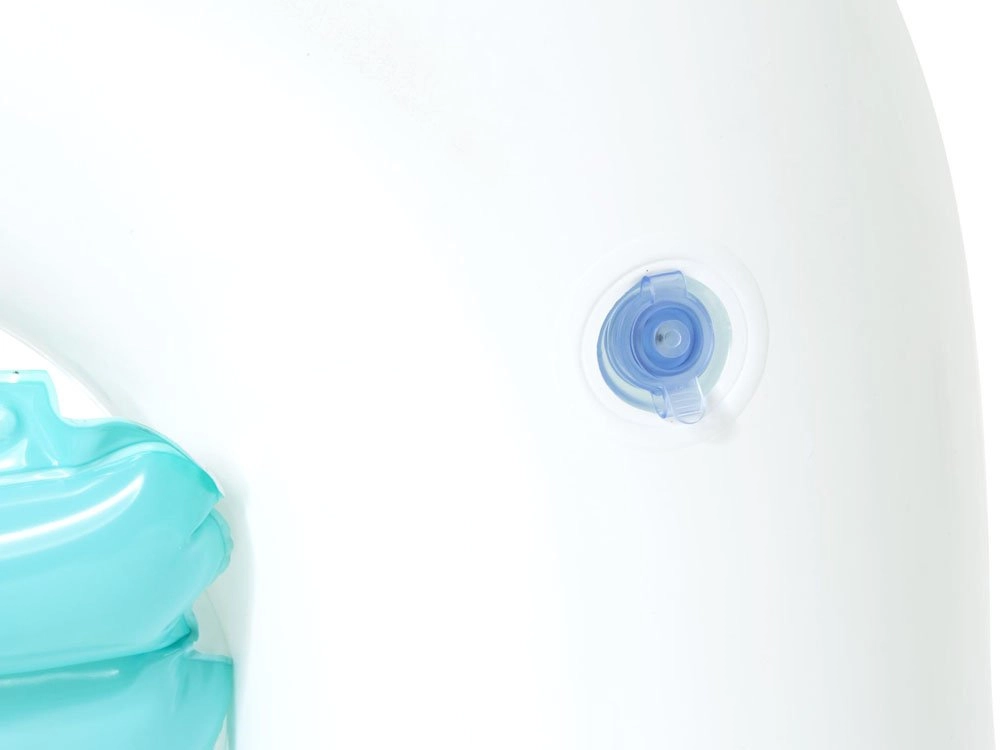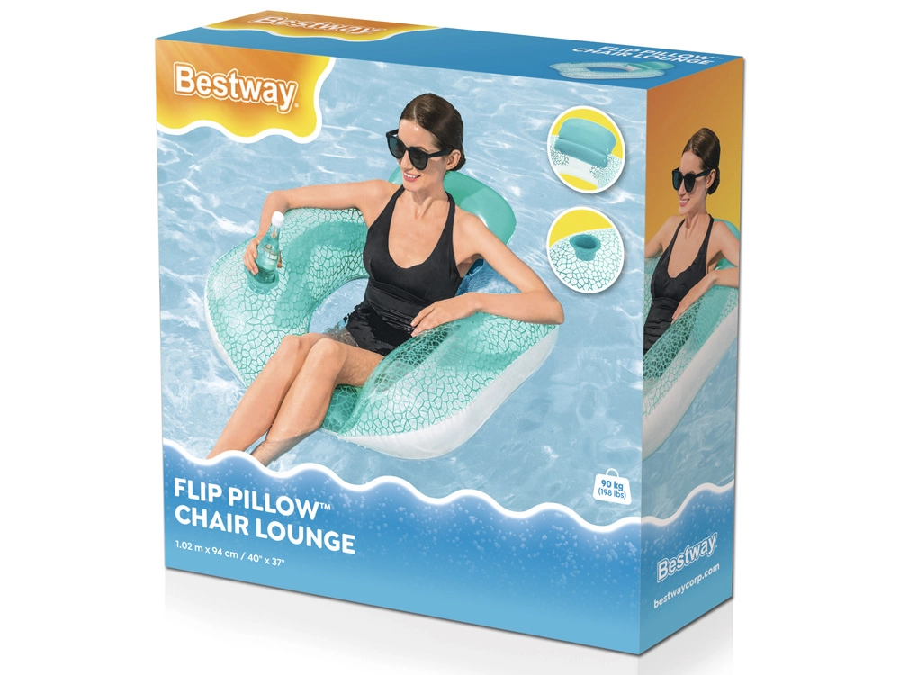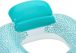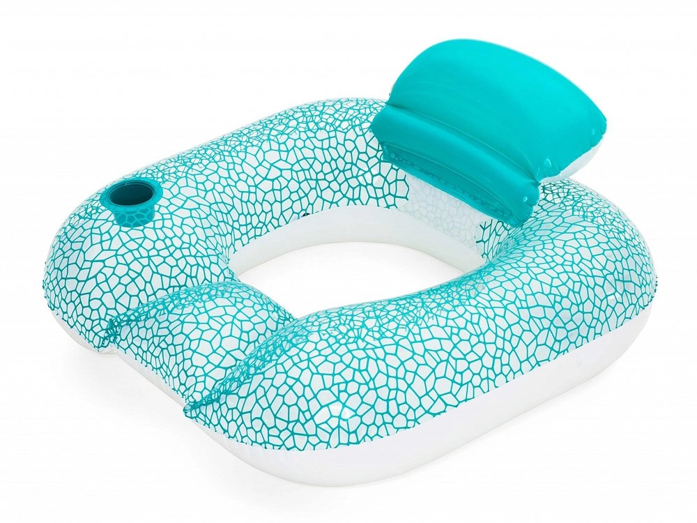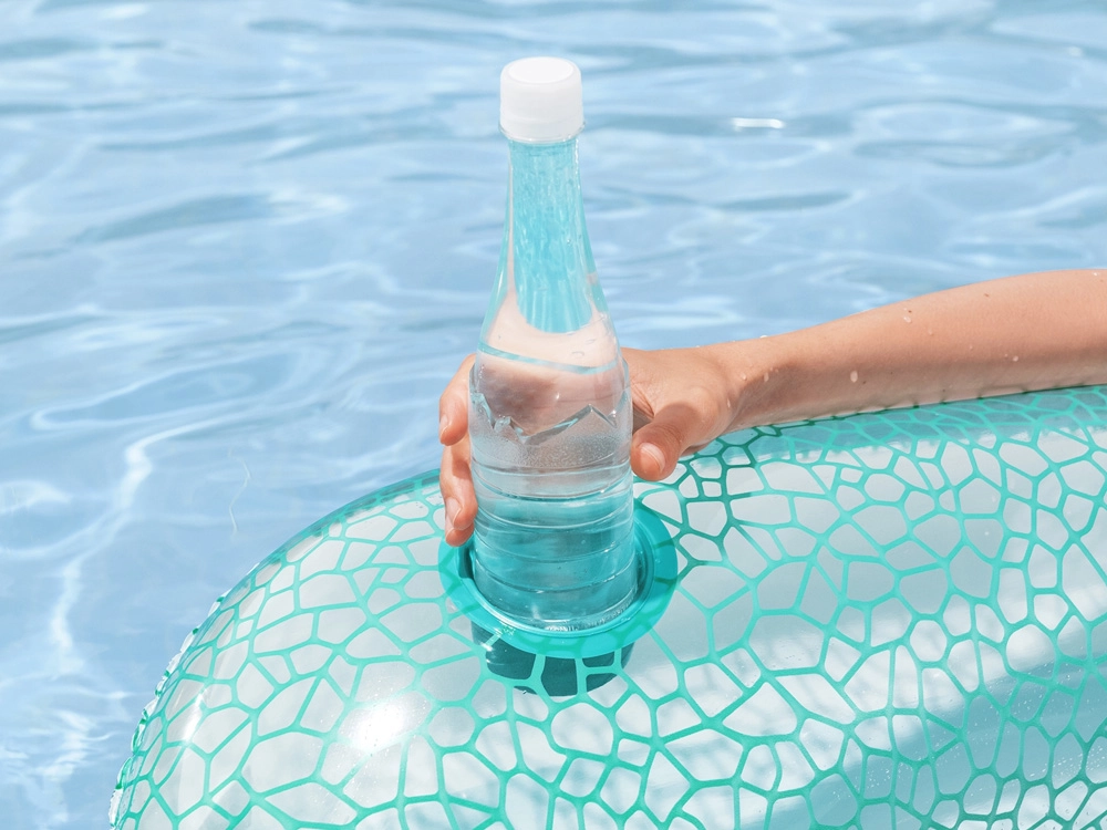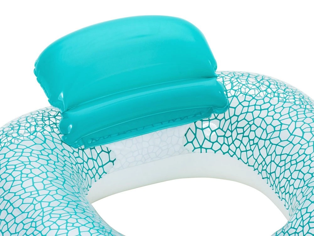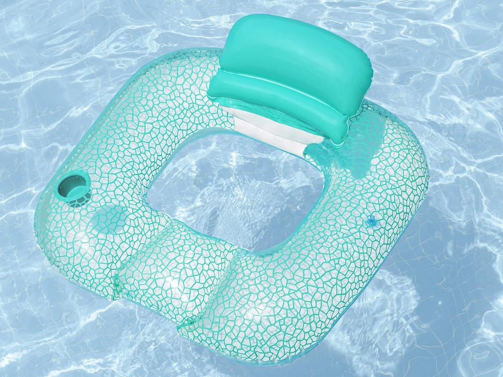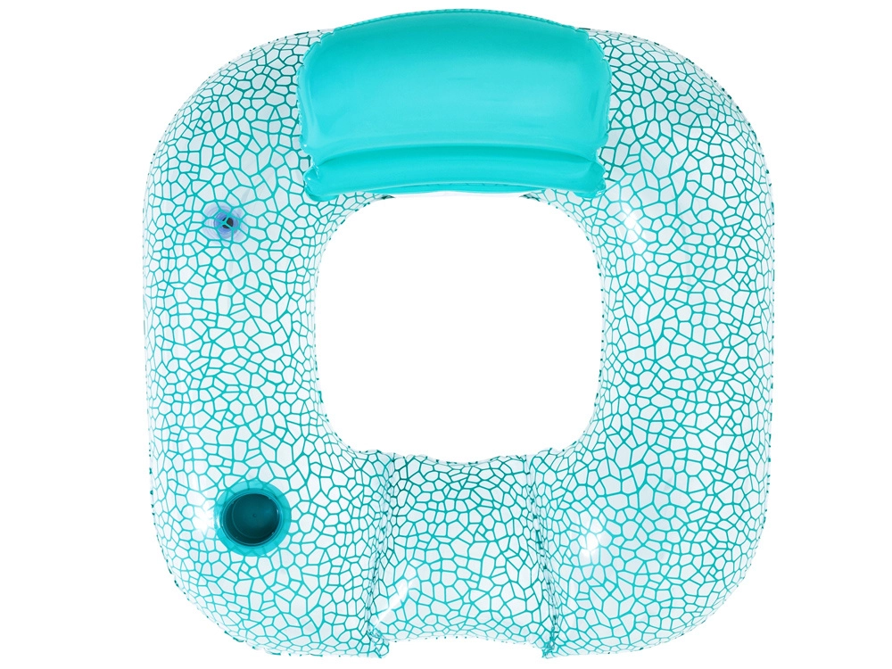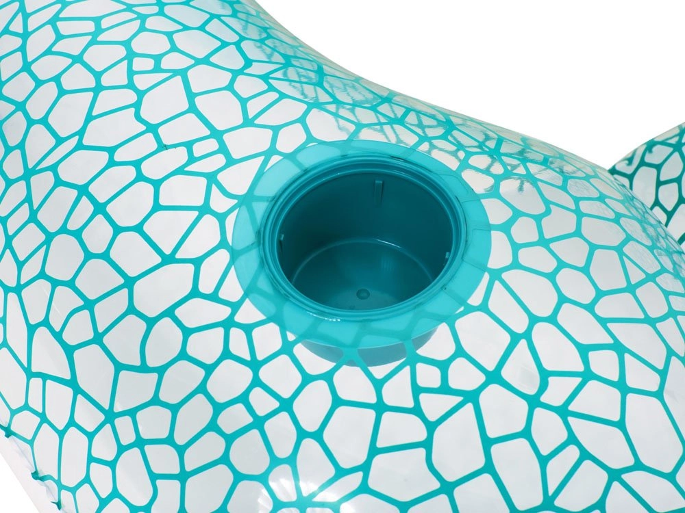 La colchoneta inflable en forma de sillón combina comodidad y practicidad para relajarte junto al agua. El respaldo ergonómico sostiene la espalda, mientras que el portavasos para vaso o botella mantiene tu bebida favorita siempre a mano. El elegante diseño mosaico turquesa y blanco destaca en cualquier superficie acuática.