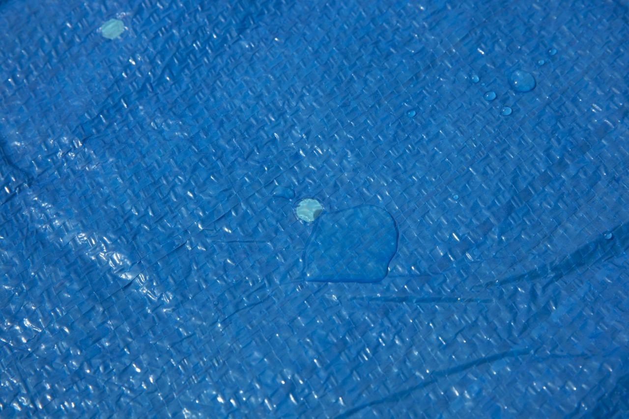 Las cuerdas de sujeción mantienen la lona en su sitio incluso con viento, y los orificios de drenaje evacuan el agua de lluvia acumulada.