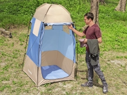 Es un accesorio imprescindible para quienes pasan el verano en la naturaleza y no quieren esperar colas en vestuarios públicos. La cabina incluye un suelo que se puede desmontar para una limpieza sencilla. Fácil de montar y desmontar, tanto para su almacenamiento como para el transporte en su funda especial.