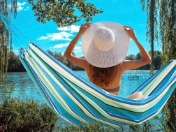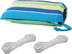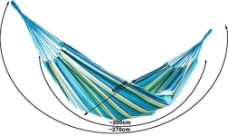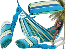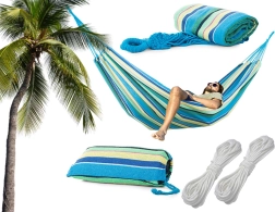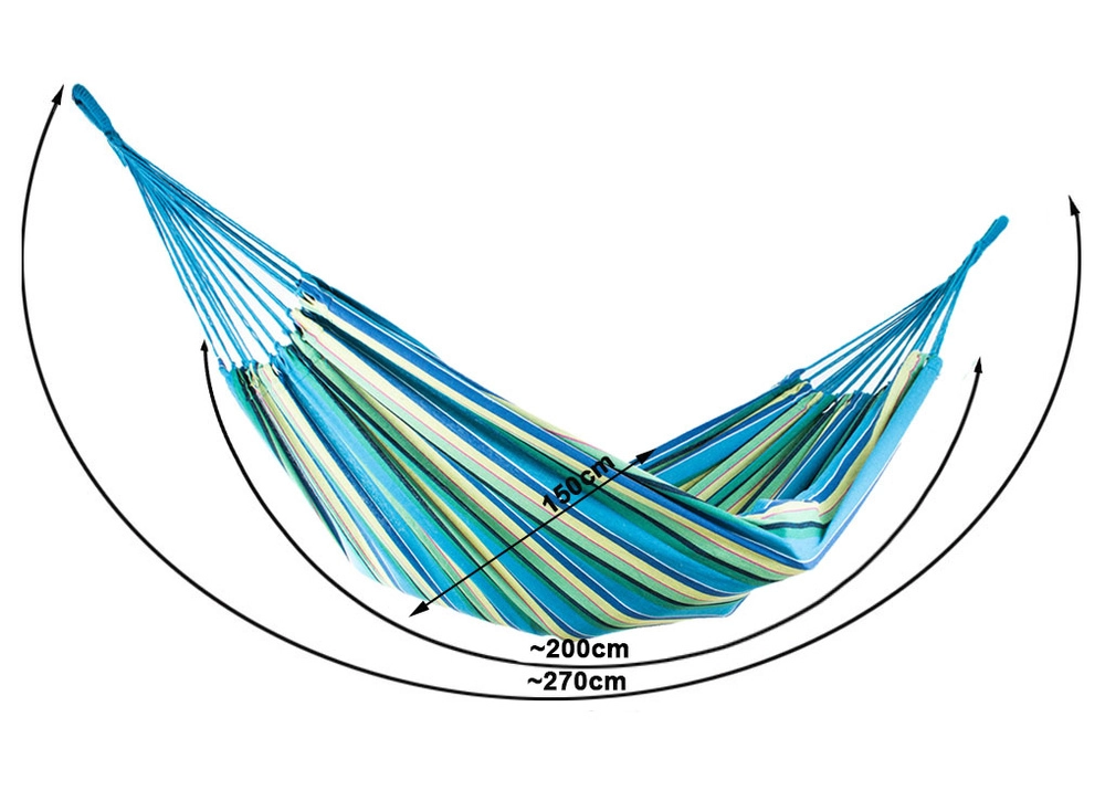 Elección ideal para el jardín, la terraza, el balcón e incluso para acampar. La hamaca se cuelga rápidamente entre árboles o en un soporte y te proporciona un agradable relax en los días calurosos. El material es transpirable, resistente y cómodo al tacto, por lo que es perfecto para el descanso diario.