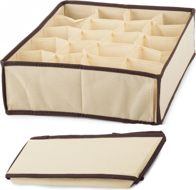 Este organizador beige es ideal para todo tipo de cajones o puede colocarse en el fondo del armario. Permite organizar fácil y prácticamente no solo la ropa interior, sino también calcetines, corbatas o cinturones, manteniendo el orden en casa. Gracias a sus laterales reforzados de cartón y al material transpirable, este organizador es resistente y, a la vez, fácil de mantener limpio.