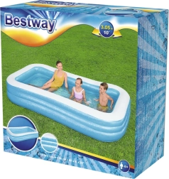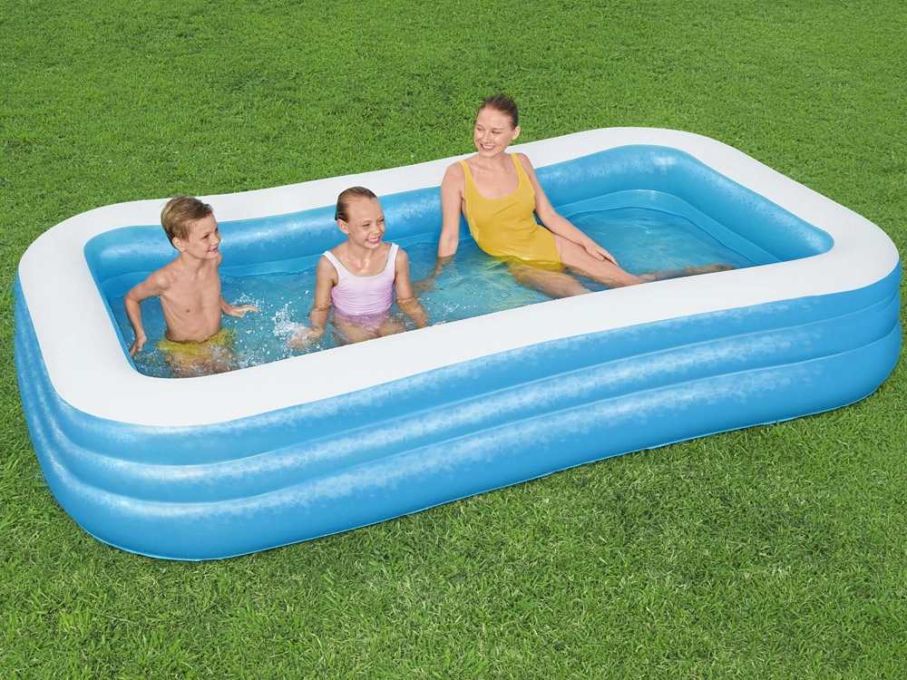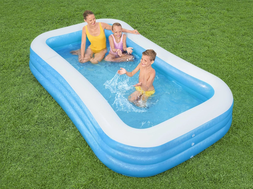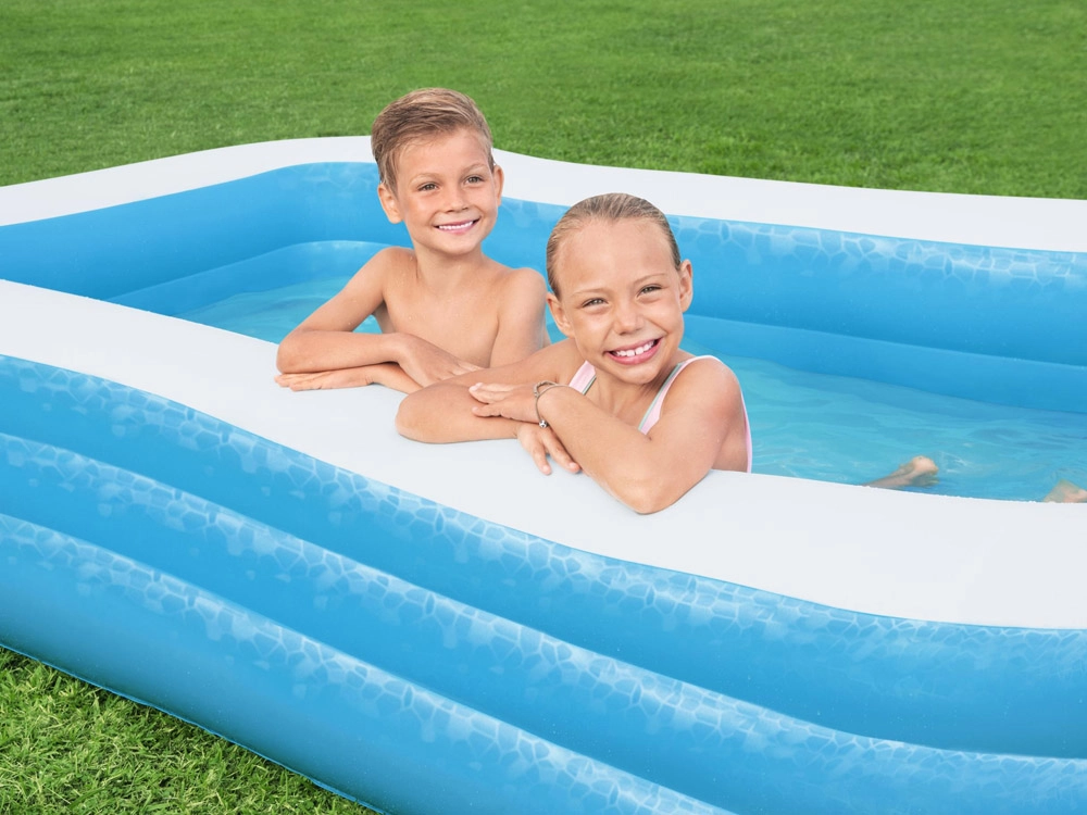 Piscina inflable Deluxe Blue con dimensiones de 305 x 183 x 56 cm, ideal para refrescarse en el jardín durante el verano. Fabricada en material PVC resistente, ofrece comodidad y seguridad gracias a las amplias paredes laterales.