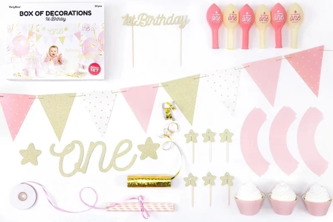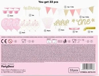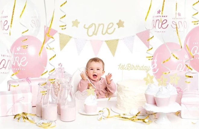 - Banner “One” (1 ud), guirnalda de papel (1 ud), decoraciones para muffins (6 uds), cápsulas para muffins rosa claro (6 uds), topper para tarta (1 ud), pajitas (10 uds), globos surtidos (6 uds), serpentinas doradas (1 ud), cinta satinada rosa claro 6 mm (1 ud)
