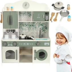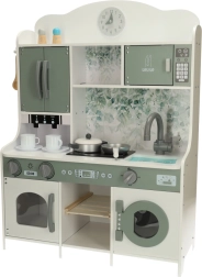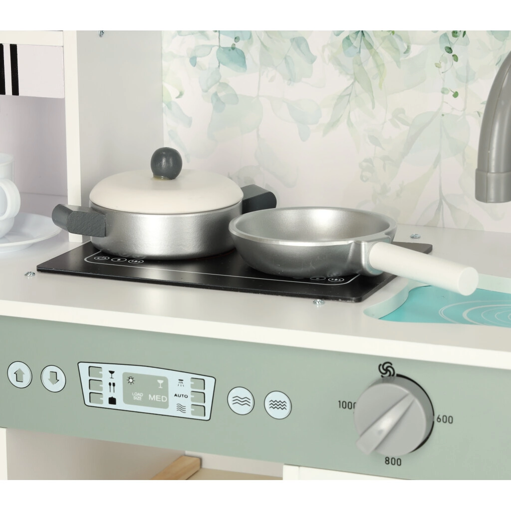La cocinita incluye microondas, lavadora, horno y cafetera, lo que permite a los niños explorar e imitar las tareas reales de una cocina.