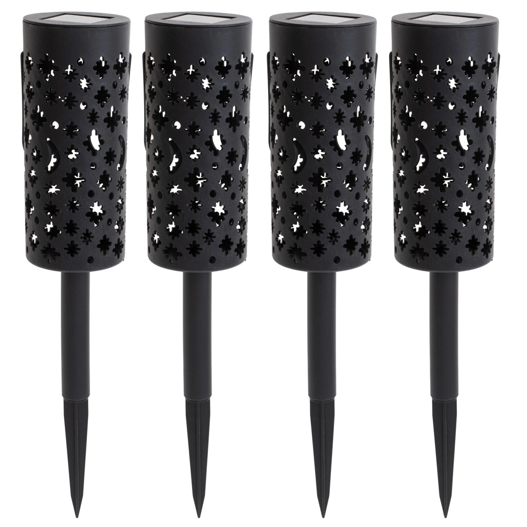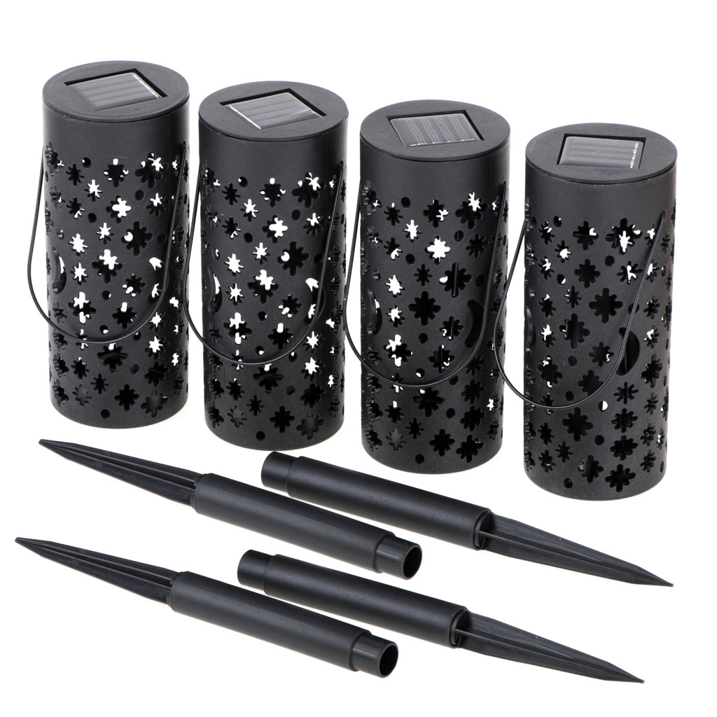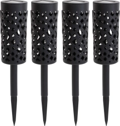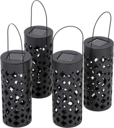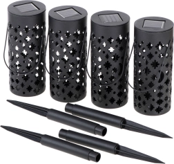 Aporta a tu jardín una atmósfera mágica con un set de 4 farolillos LED solares. Sin cables, encendido automático al anochecer gracias al sensor, funcionamiento eficiente y patrones luminosos decorativos de estrellas y lunas que transforman senderos, parterres o la terraza en un lugar acogedor.