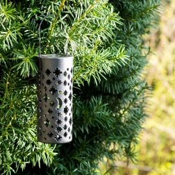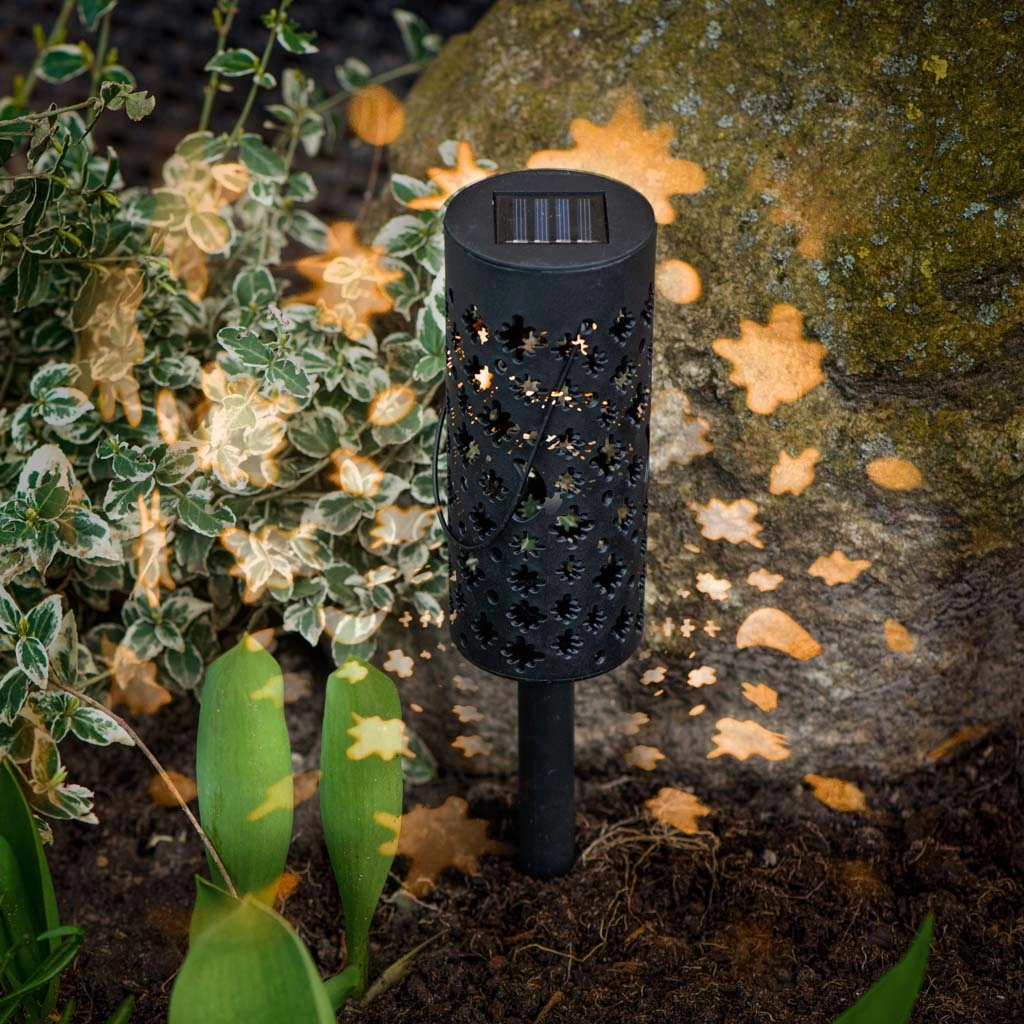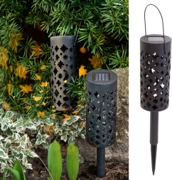 Estos farolillos solares de jardín se pueden clavar en la tierra o colgar de una rama y dejar que se carguen con el sol durante el día. La batería incorporada y el sensor crepuscular garantizan que las luces se enciendan automáticamente justo cuando las necesitas. La perforación decorativa crea, al encenderse, llamativos dibujos de estrellas y luna.