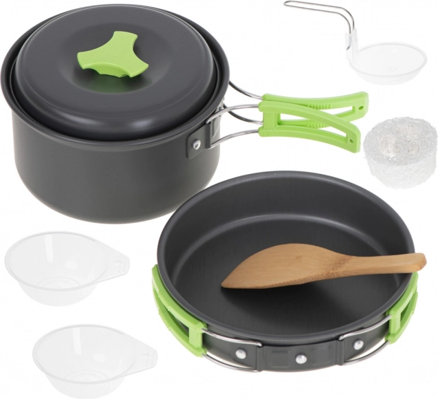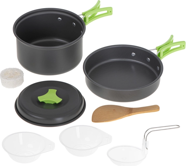 El set incluye una sartén, una olla y una tapa, fabricadas en aluminio para un cocinado rápido y eficiente. Dos cuencos para compartir la comida, una espátula de madera para remover y un cucharón hacen que la preparación de platos calientes sea simple y cómoda.