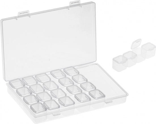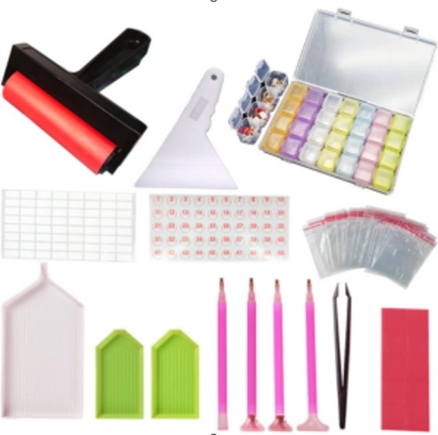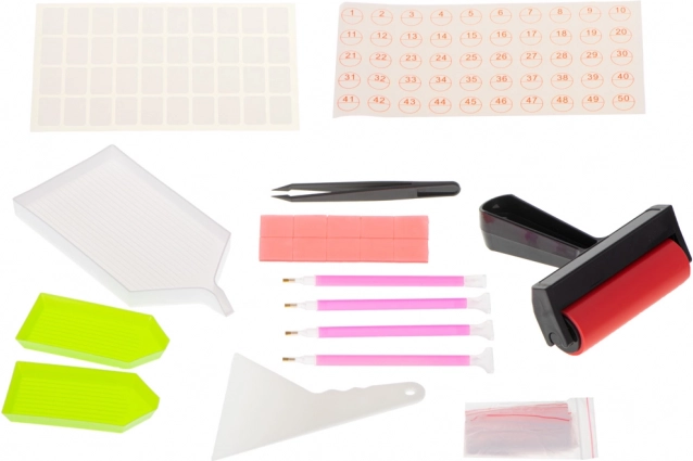 Contenido del set: Rodillo, 2 bandejas estándar, 1 bandeja grande con boquilla, 4 bolígrafos, 1 pinza, pegatinas, 1 espátula, separador para gemas, 20 bolsas con cierre. Todo empaquetado en una bolsa con cierre.