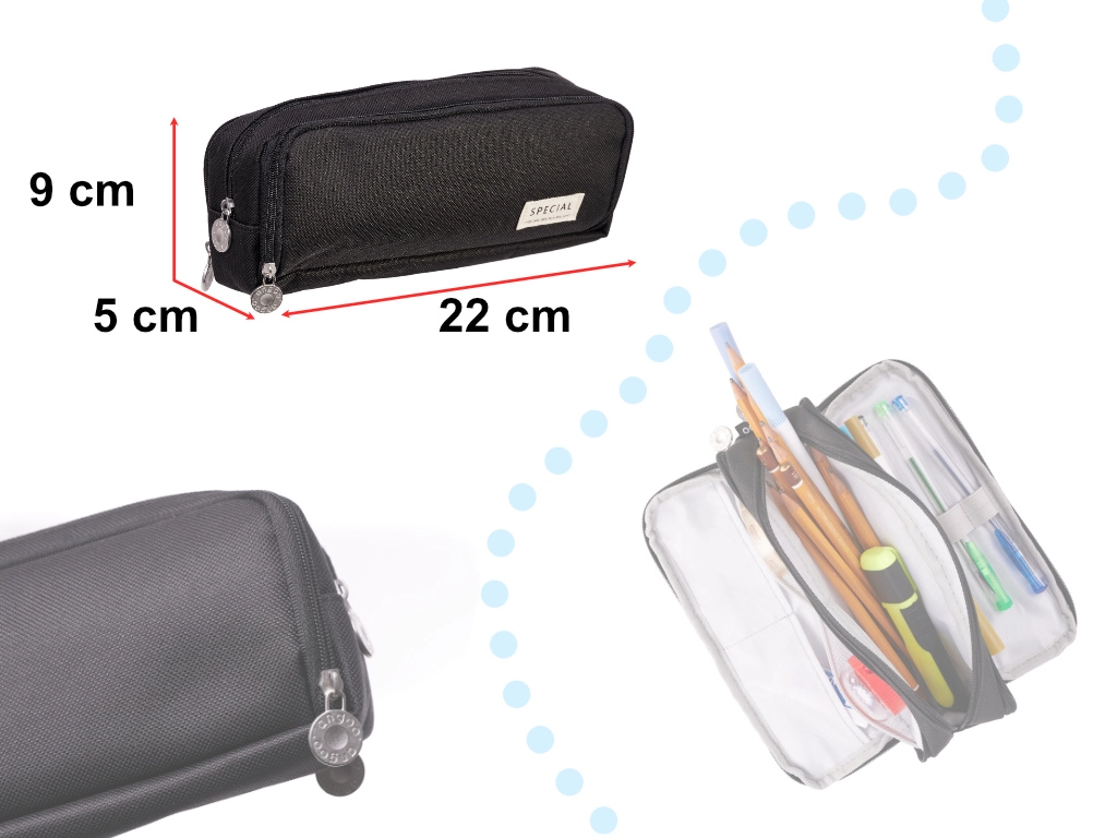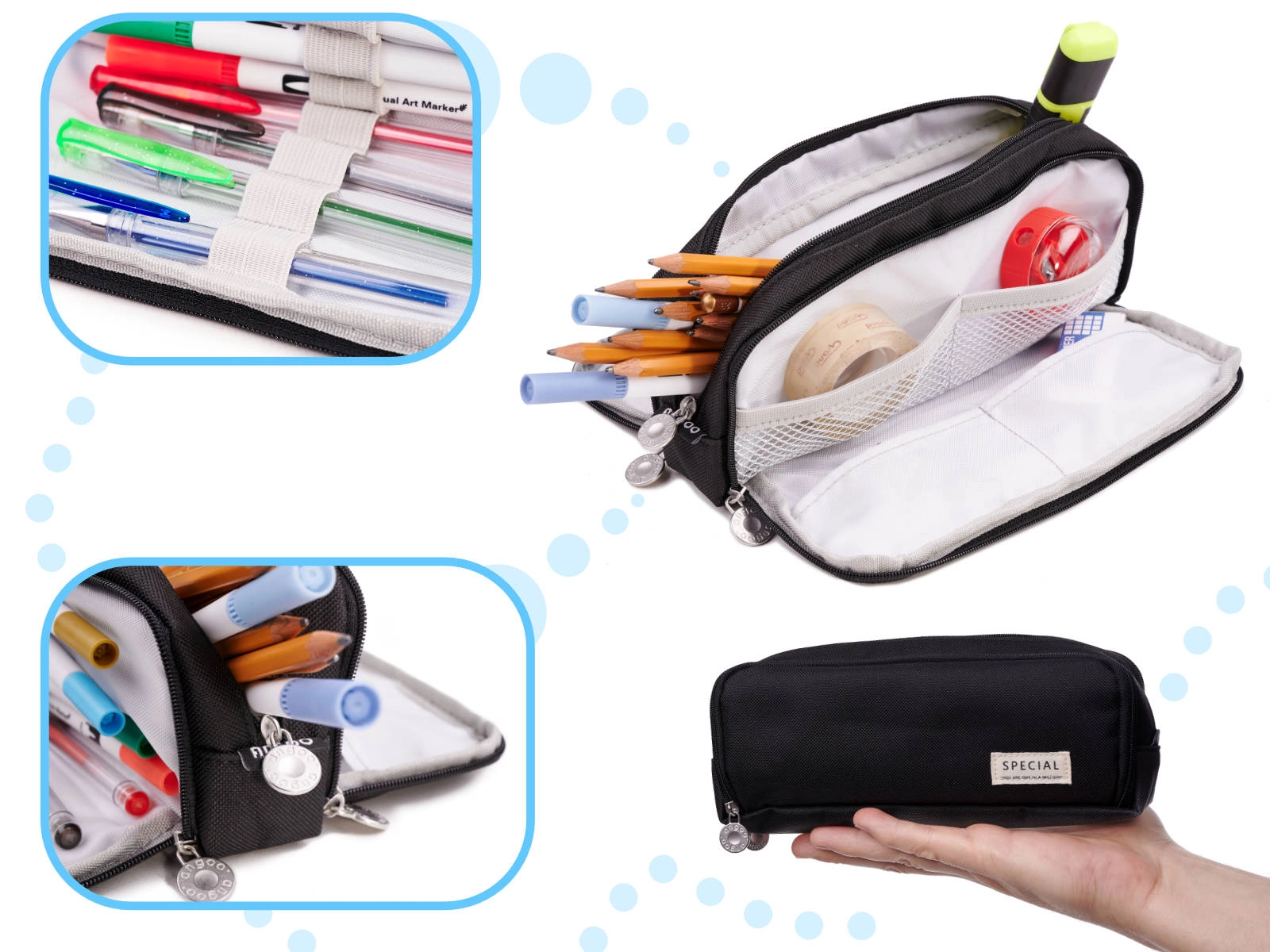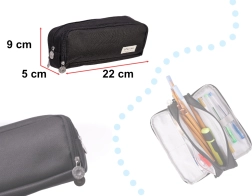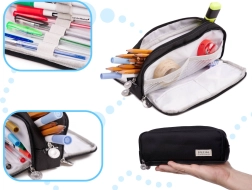Estuche universal para el colegio, la universidad y la oficina. Tres compartimentos independientes con cremallera facilitan la organización y el acceso rápido a lápices, rotuladores, regla y otros accesorios. En los laterales encontrarás pequeños bolsillos y bandas elásticas que ayudan a sujetar firmemente los accesorios.