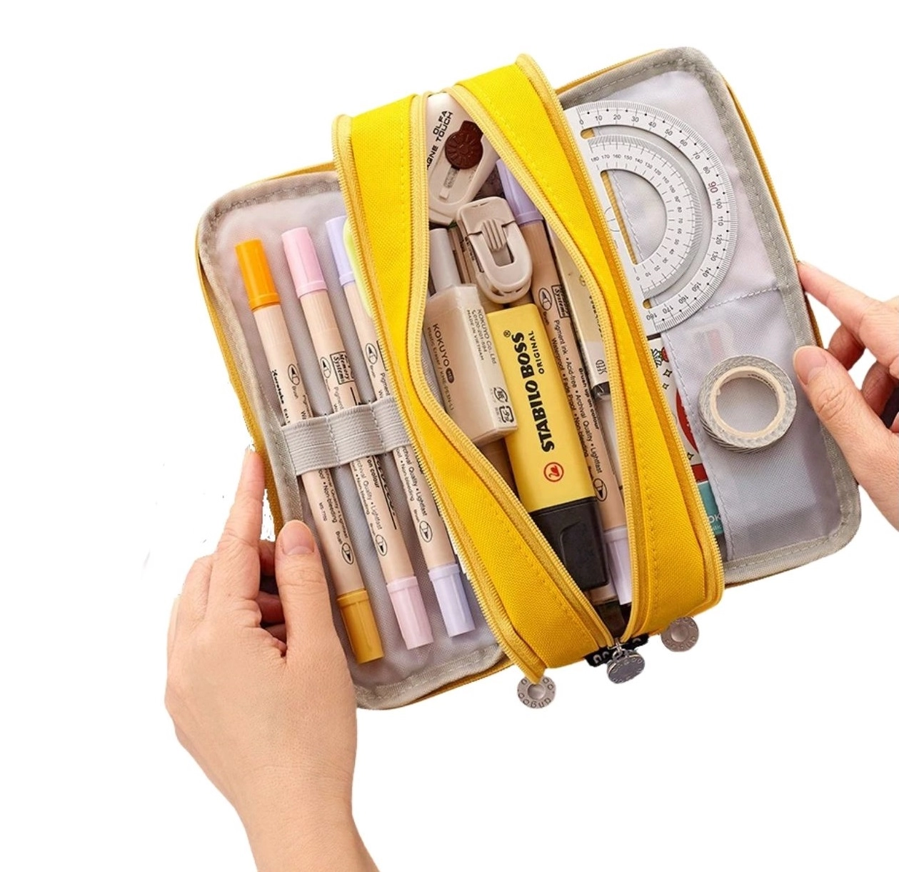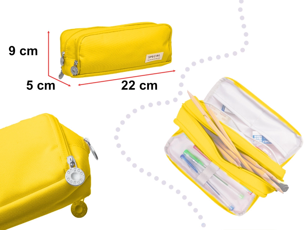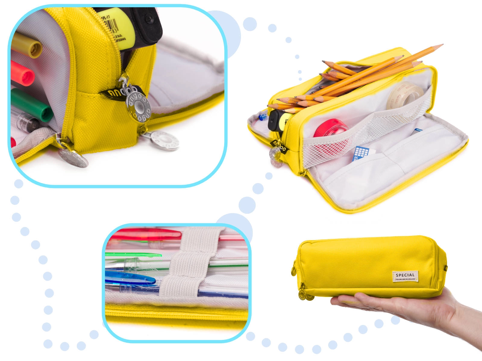 Adiós al caos en la mochila. Este estuche multifuncional con 3 compartimentos independientes con cremallera guarda lápices, bolígrafos, subrayadores, regla y pequeños objetos. Gracias a los bolsillos interiores y bandas elásticas tendrás todo a mano y perfectamente ordenado. También sirve de neceser o organizador de viaje.