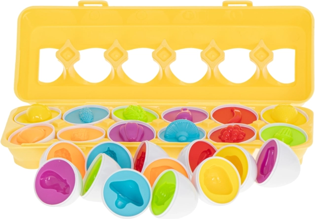 El juego requiere que los niños unan las mitades de los huevos con la forma y el color correctos, lo que fomenta el pensamiento lógico.