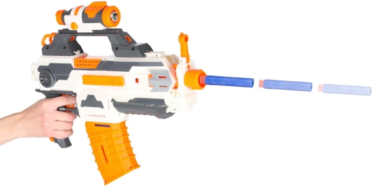 - Bláster con rieles tácticos, linterna, silenciador de cañón desmontable, 2 cargadores (6 y 10 dardos), 30 dardos de espuma, culata con soporte para cargador, manual con ilustraciones
