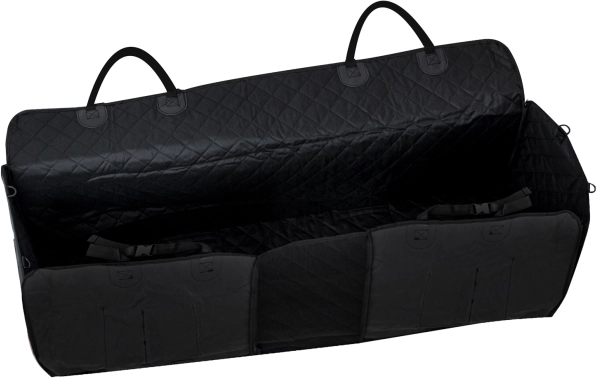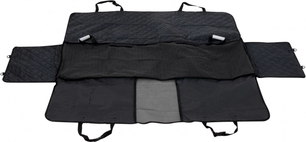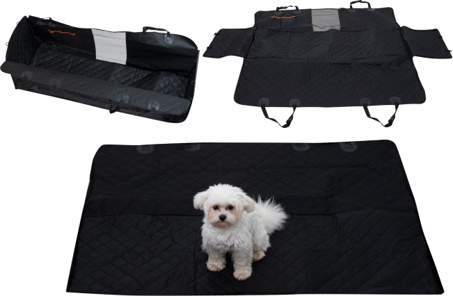 La gran manta universal para coche en forma de caja protectora se fija rápidamente a los reposacabezas con correas ajustables y cubre de forma fiable toda la zona de los asientos traseros. Las cremalleras laterales permiten levantar los laterales y crear un espacio cerrado, evitando que el perro salte al abrir la puerta. La capa impermeable y fácil de limpiar mantiene el interior impecable incluso tras paseos bajo la lluvia o por el bosque.
