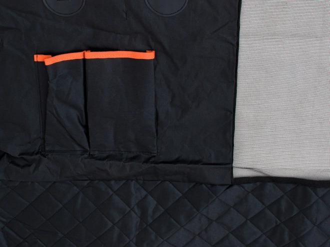 En la parte delantera hay un panel de malla que mejora el flujo de aire y permite al perro verte a ti y la carretera sin intentar pasar a los asientos delanteros. La parte inferior es de material antideslizante para mayor estabilidad, incluye aberturas para cinturones de seguridad y dos bolsillos prácticos para correa o premios. Gracias a los materiales resistentes y a los aros metálicos, la funda puede fijarse adicionalmente a las asas sobre las puertas para una seguridad extra.