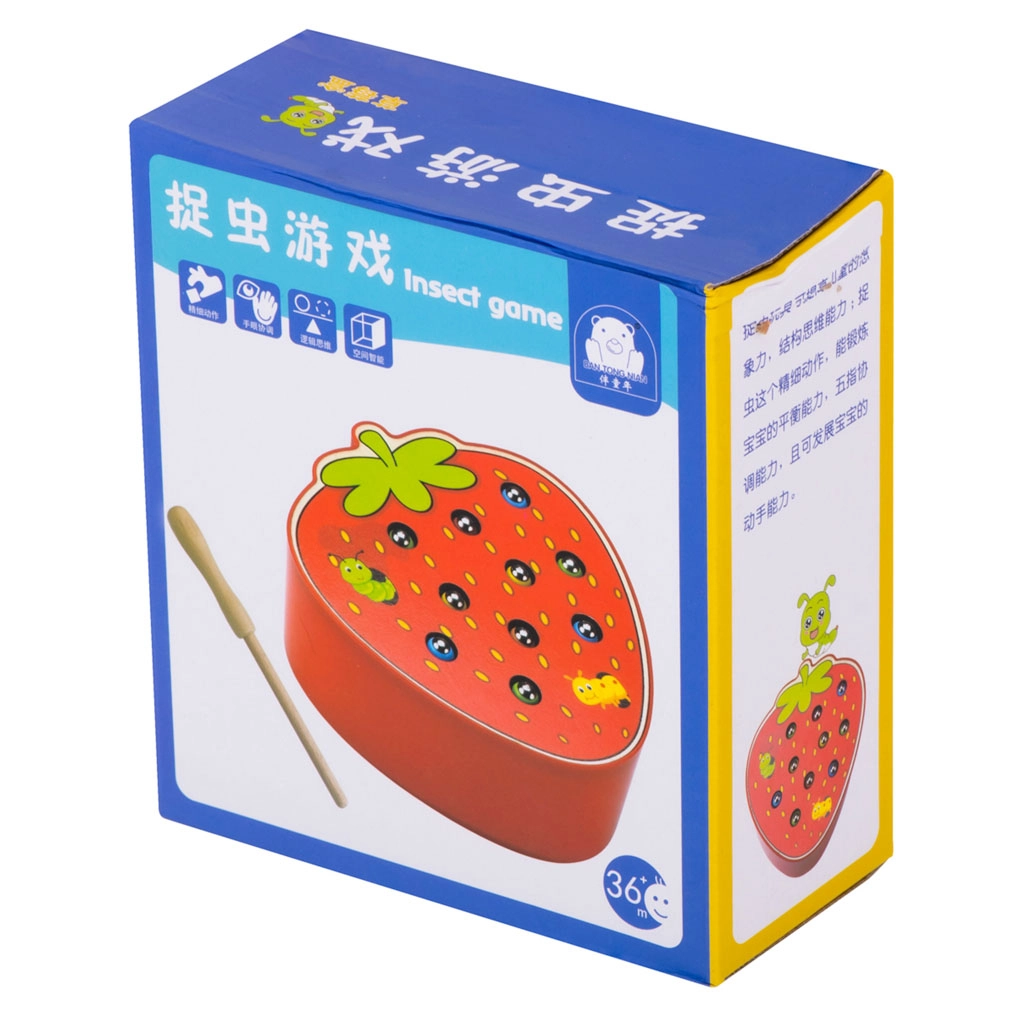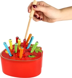 Divertido juego motriz de madera con forma de fresa, en el que los niños atrapan orugas de colores con una varita magnética. Desarrolla la motricidad fina, la coordinación mano‑ojo, la concentración y la paciencia. Diseño seguro, base resistente y aspecto atractivo para jugar a diario.