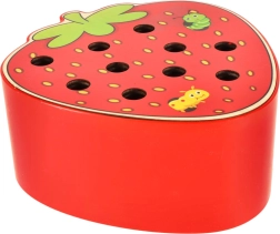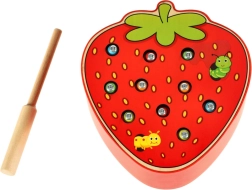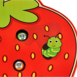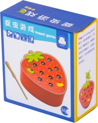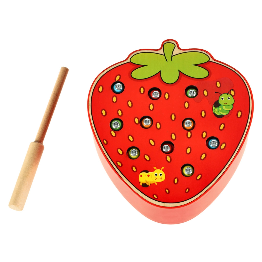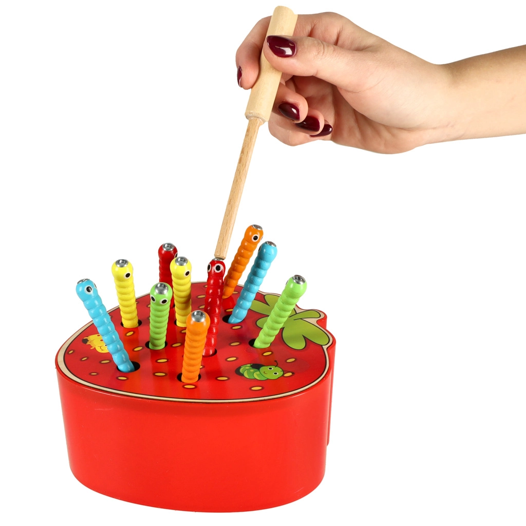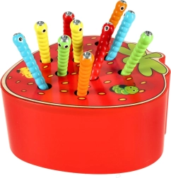 Este juego magnético con forma de fresa entretendrá a los niños durante horas. En el cuerpo de la fresa se esconden 10 orugas de colores con terminación metálica que el niño atrapa y extrae con una varita de madera con imán. La variante más desafiante consiste en devolver las orugas con precisión a su lugar tras atraparlas.