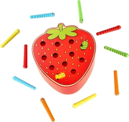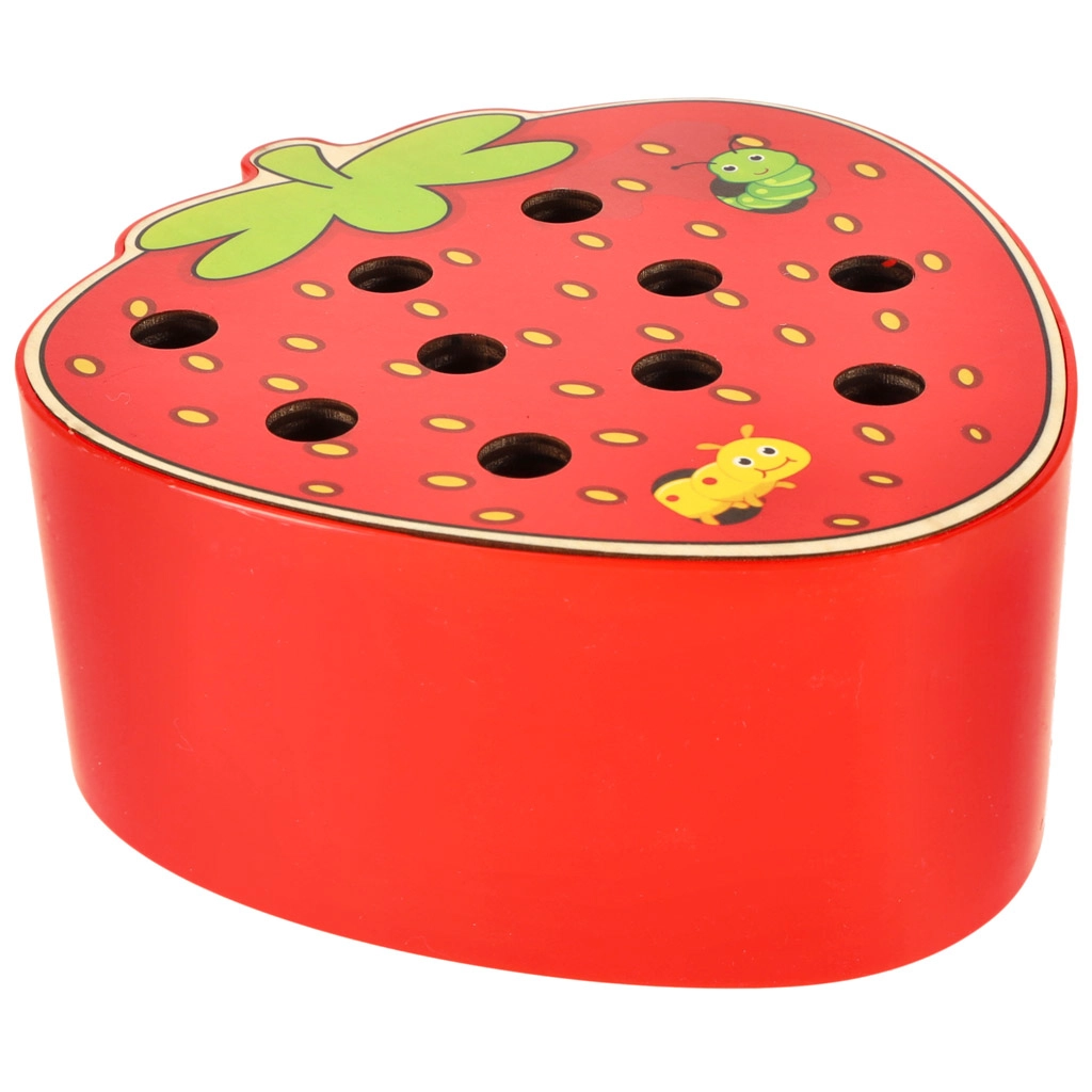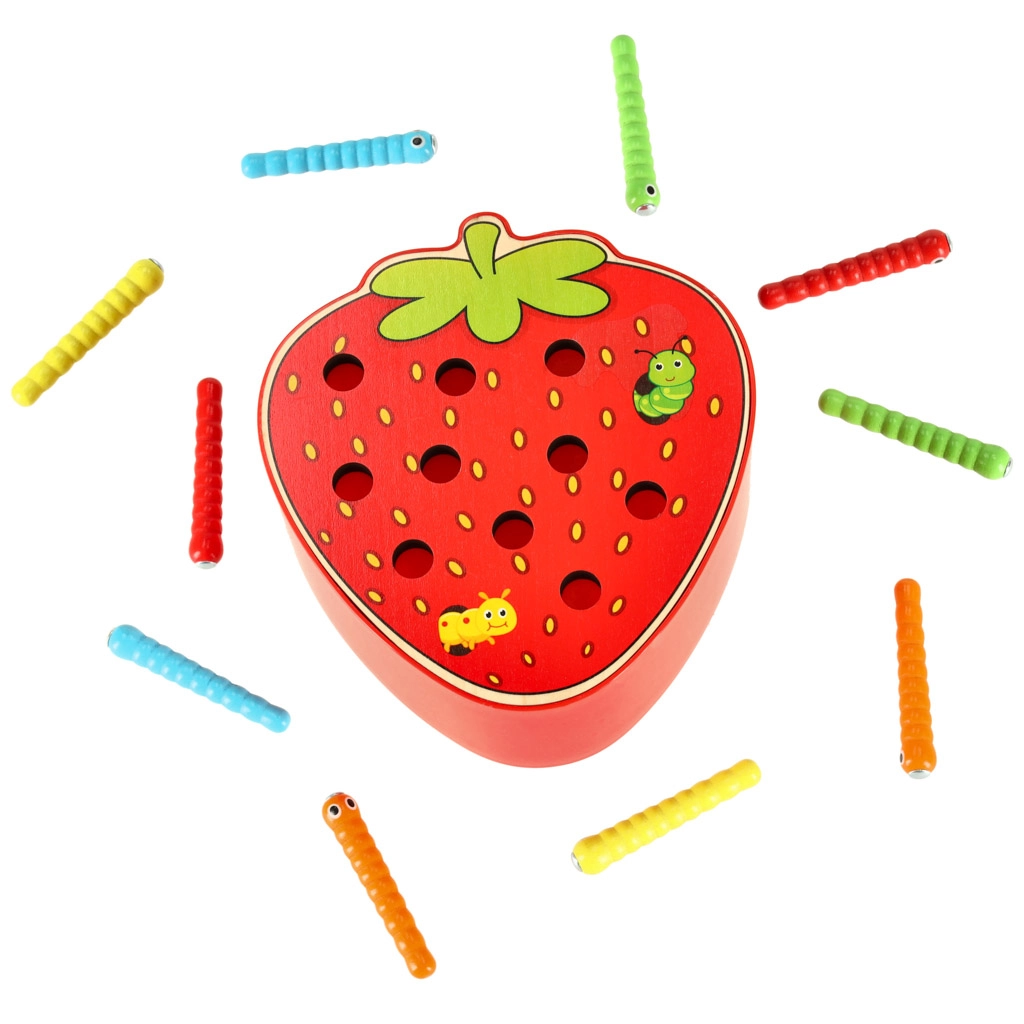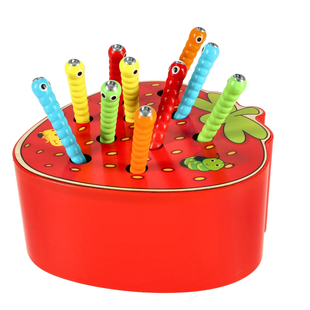 - Juego completo: base de madera con forma de fresa, 10 orugas de colores, varita magnética.