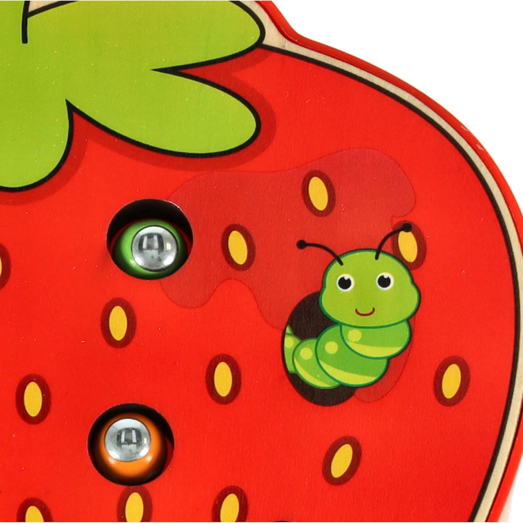 Incluye una base de madera con forma de fresa, 10 orugas de colores con extremo metálico y una varita magnética de madera.
