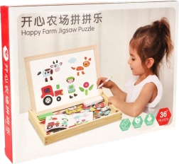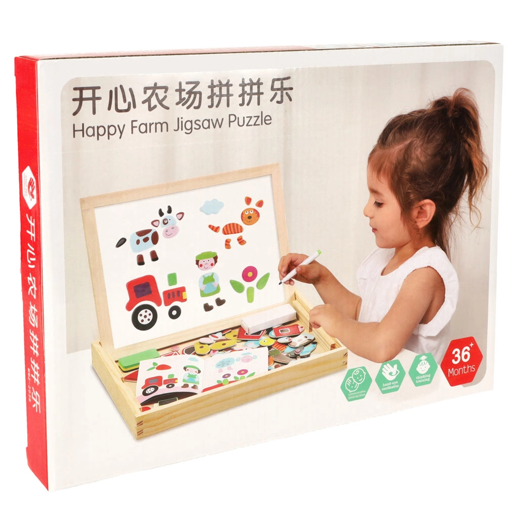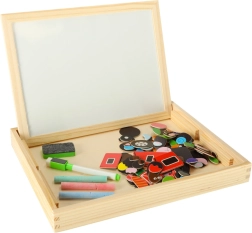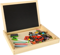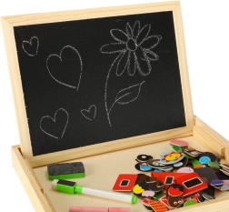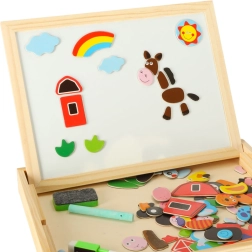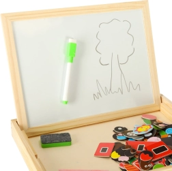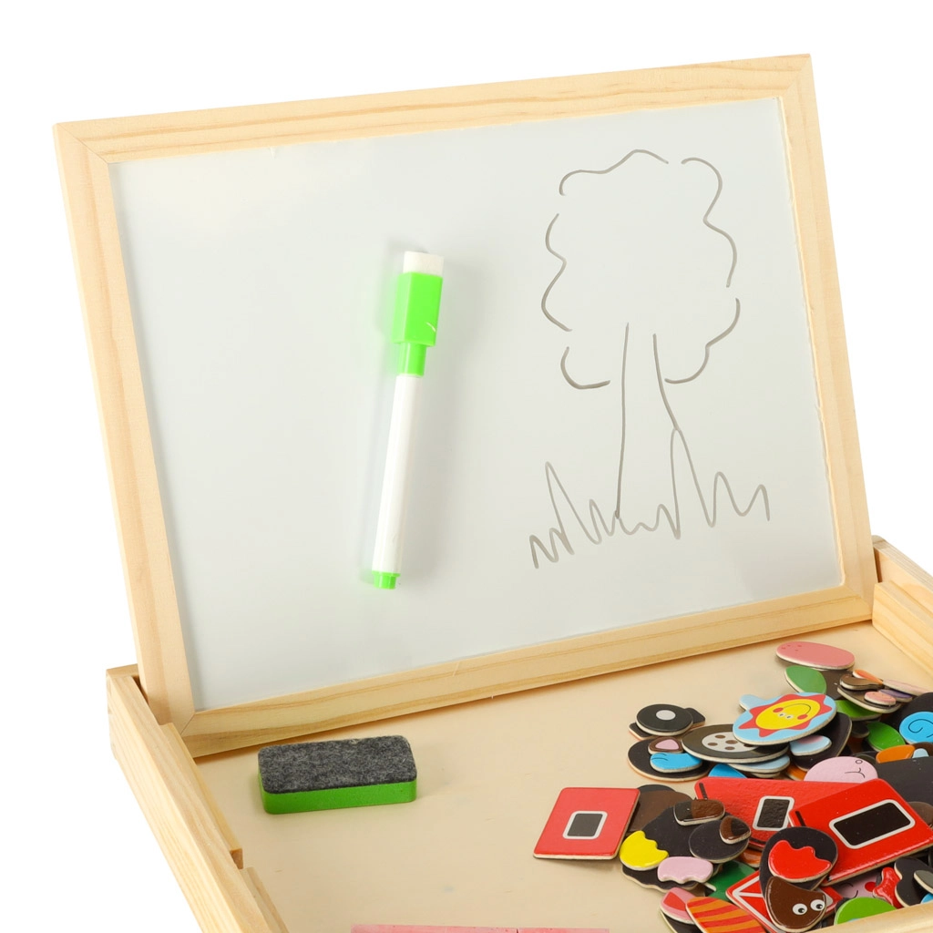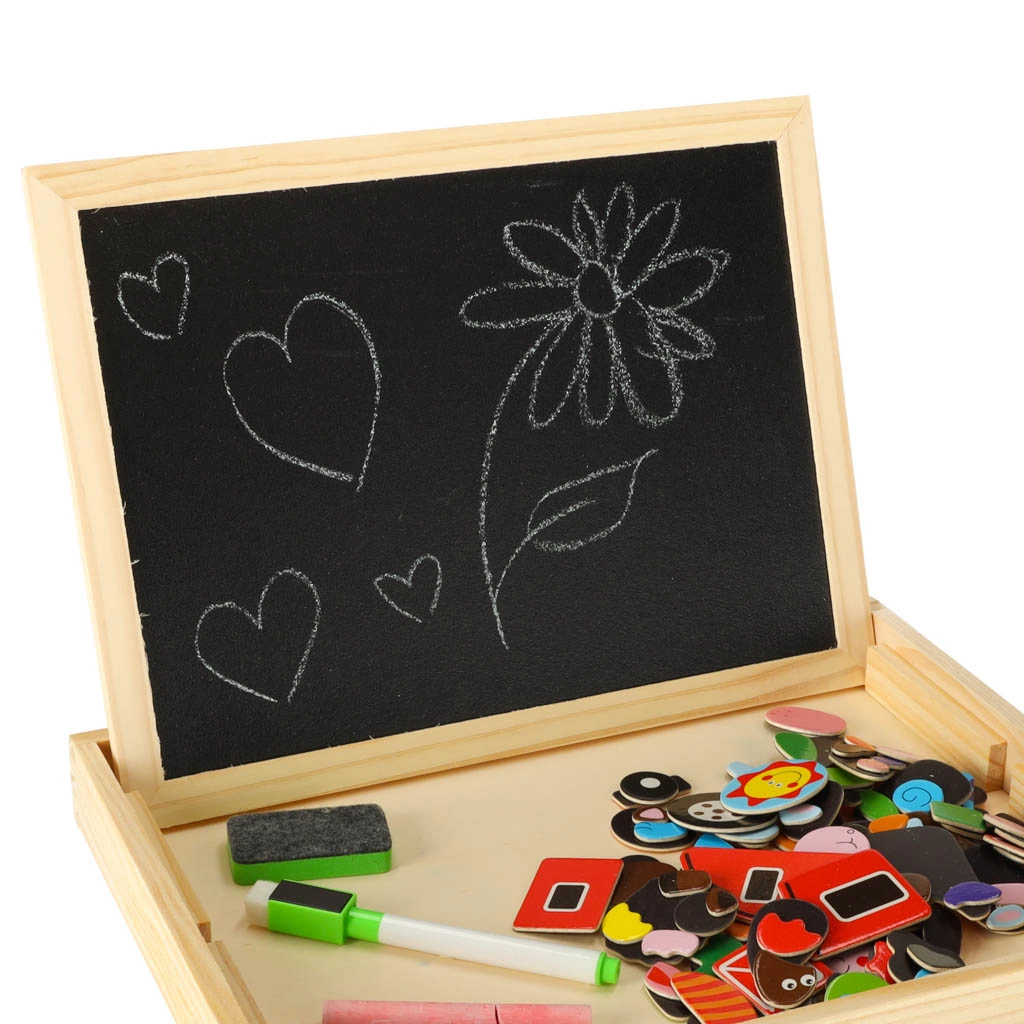 La pizarra de madera de doble cara con puzzles magnéticos es ideal para la diversión creativa de los niños. La pizarra está hecha de madera natural de alta calidad e incluye varios elementos que fomentan el aprendizaje y el juego.