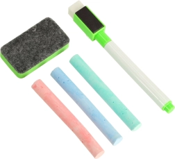 El set incluye todo lo necesario, como tizas de colores, esponja y rotuladores con borrador de fieltro para una diversión completa.