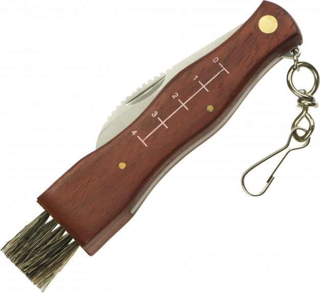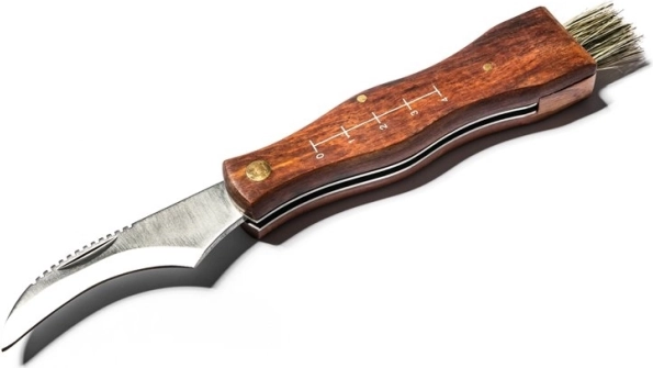 Práctico cuchillo para setas con hoja plegable y mango de madera, complementado con un cepillo integrado para limpiar setas y una mosquetón para enganchar. Gracias a sus dimensiones compactas, siempre lo puedes llevar a mano y de forma segura en el bolsillo.
