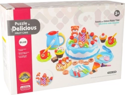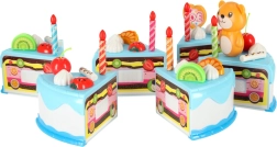 Seis porciones de pastel unidas con velcro se pueden cortar de forma segura con el cuchillo de plástico y volver a unir. Los niños lo decoran con velas, fruta y un tierno osito, cada vez de forma diferente.