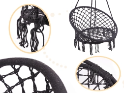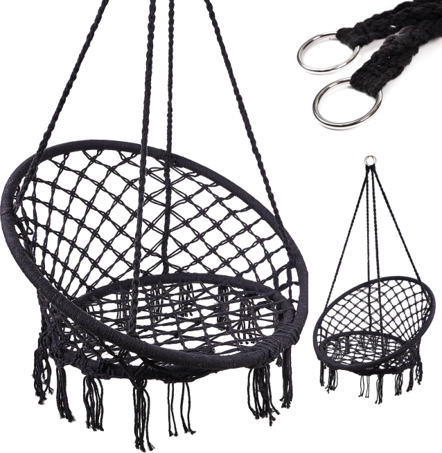 Crea tu propia zona de relax: el “nido de cigüeña” colgante es perfecto para el descanso de los adultos y el juego de los niños. Su diseño atemporal en color negro combina fácilmente con cualquier interior y exterior. Las cuerdas resistentes con trenzado especial y la estructura metálica garantizan estabilidad y seguridad al balancearse.