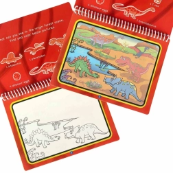 El cuaderno incluye 4 páginas reutilizables con encuadernación en espiral. Al secarse, la imagen se aclara y el niño puede pintar una y otra vez. Sus dimensiones compactas son ideales para llevar en la mochila de viaje.