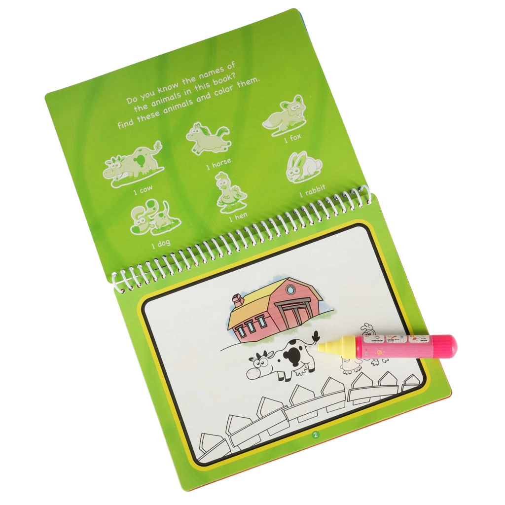 Descubre divertidos libros para colorear con agua con temática de granja que colorean solo con agua, ¡sin desorden! Solo hay que llenar el rotulador incluido con agua y los colores aparecerán mágicamente. Ideal para pequeños artistas, fomenta la creatividad, la motricidad fina y ofrece pintura segura y limpia en casa y durante los viajes.