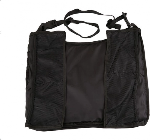 Cuatro bolsillos de malla para accesorios y correas ajustables con hebillas para una fijación rápida a la silla de coche o al cochecito.