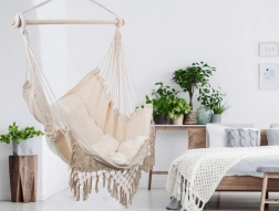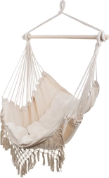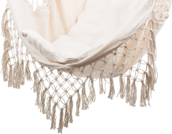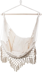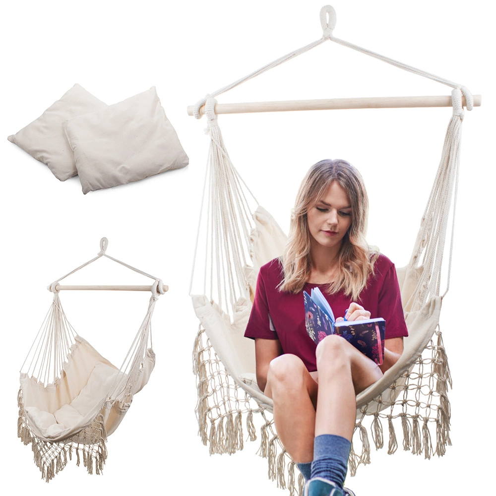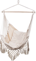 El borde de macramé y los flecos decorativos enfatizan el look boho, que combina muy bien con plantas y accesorios naturales. Gracias al anclaje de un solo punto, fijarás la silla fácilmente a un gancho de techo o a un soporte. El paquete incluye 2 cojines suaves para mayor confort al leer y relajarte.
