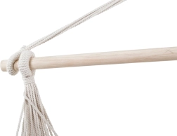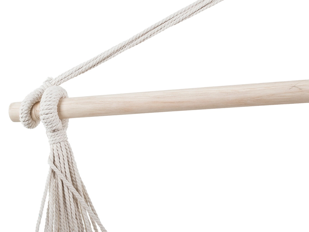 La estilosa silla colgante de estilo brasileño convierte el balcón, la terraza o el salón en un oasis de calma. El tejido resistente de algodón grueso con mezcla de poliéster es agradable al tacto, transpirable y a la vez duradero. La amplia barra de madera mantiene el asiento abierto, aumenta la estabilidad y evita que se retuerza.