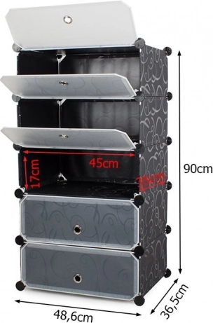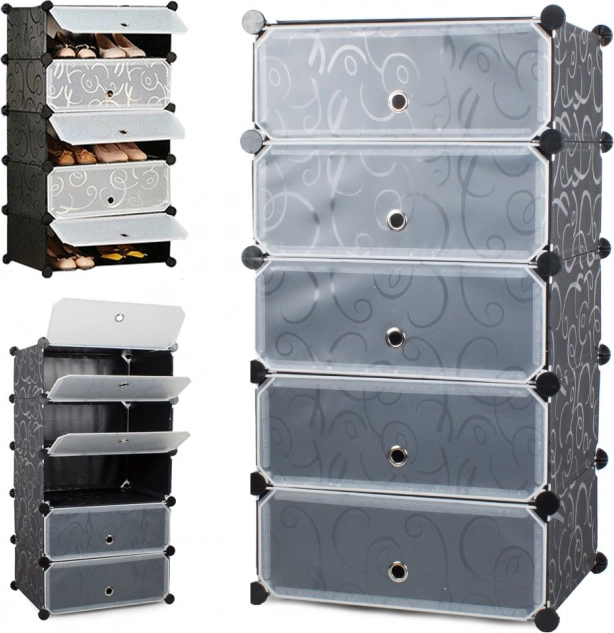 El mueble para zapatos cuenta con 5 estantes, que pueden apilarse de forma flexible o colocarse uno al lado del otro según el espacio y la necesidad. La estructura es ligera y estable, lo que facilita su manipulación y montaje. Gracias a las ventanillas transparentes, encontrará fácil y rápidamente lo que busca. El material del armario es impermeable y puede limpiarse sin problemas.