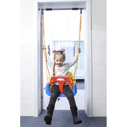 El respaldo alto, la barra en T, los arneses ajustables y la superficie antideslizante mantienen al niño estable y evitan deslizamientos durante el balanceo.