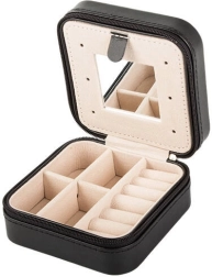 Este joyero con exterior negro e interior de terciopelo beige es una opción ideal para el uso diario y para viajar. Su disposición clara permite guardar anillos, pendientes, cadenas y pequeños accesorios, mientras que el espejo integrado facilita los retoques rápidos.