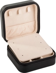 El joyero de 10 × 10 × 5 cm cabe en cualquier bolso y, gracias a su diseño inteligente, aloja anillos, pendientes y cadenas.