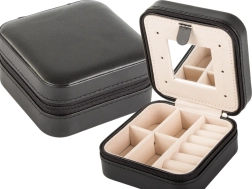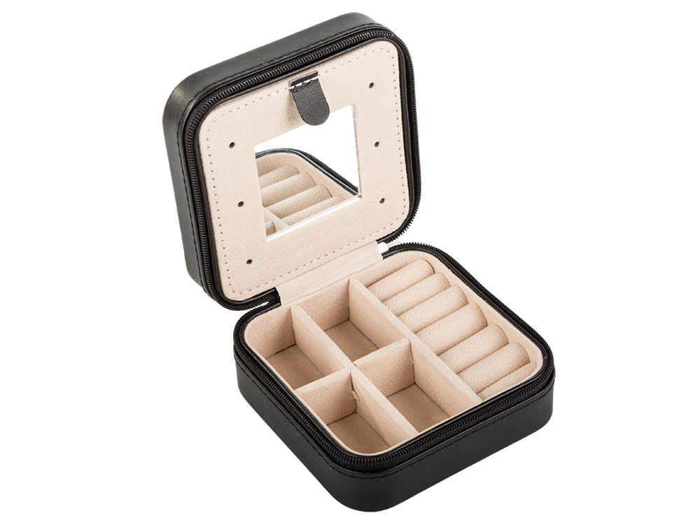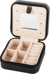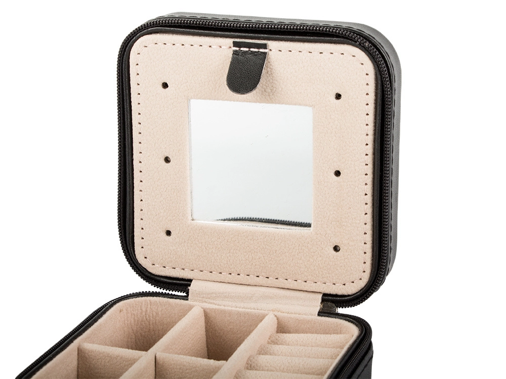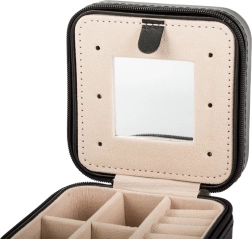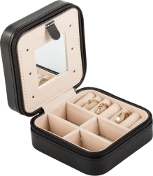 Elegante joyero de viaje con dimensiones compactas que protege y organiza tus joyas en casa y durante los viajes. Ofrece varios compartimentos, espacio acolchado para anillos, ganchos para cadenas y un práctico espejo. Gracias al cierre de cremallera, tus accesorios están seguros y el suave interior de terciopelo evita los arañazos.