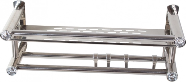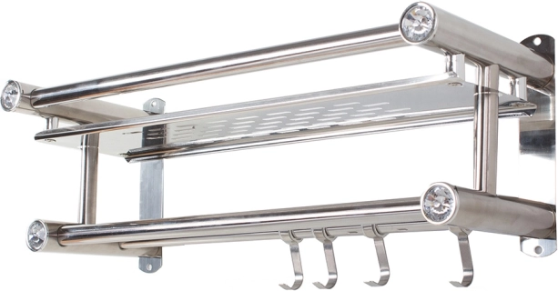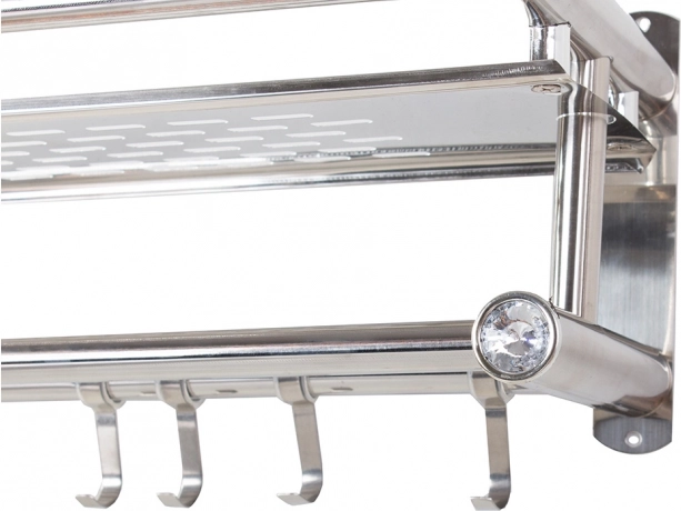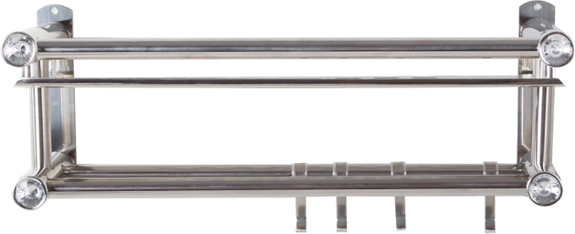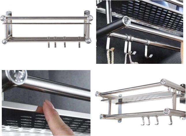 Elegante estante de baño colgante en color plateado que combina una superficie de almacenamiento espaciosa, dos barras para toallas y cuatro prácticos ganchos. La estructura ligera y resistente de aluminio es ideal para el uso diario y, gracias a su diseño universal, encaja en interiores modernos y clásicos.