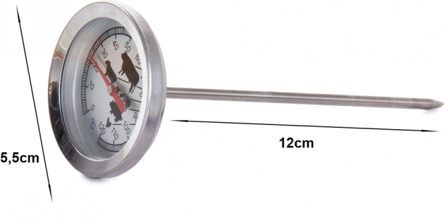 La esfera indicadora cuenta con gráficos de animales, lo que facilita la lectura de la temperatura óptima para distintos tipos de carne. Mide cómodamente temperaturas de 0 a 120 grados Celsius.