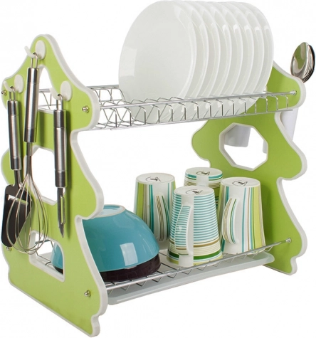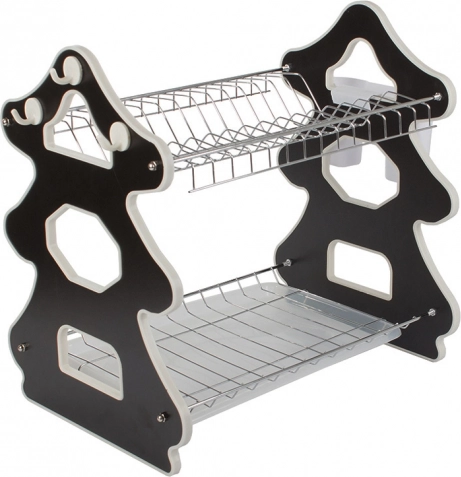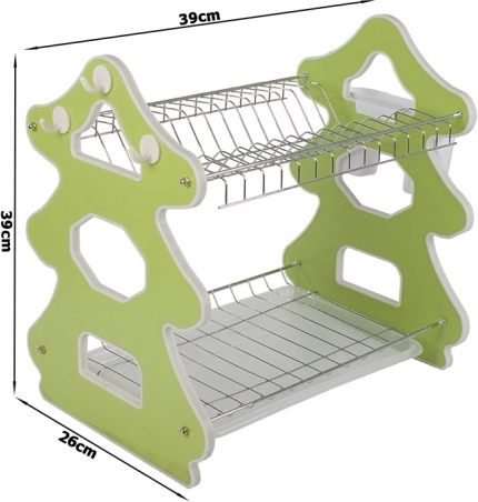 Práctico escurreplatos de dos niveles que ahorra espacio en la encimera y mantiene la cocina en perfecto orden. Ofrece una balda superior para platos y una inferior para tazas y cuencos, soporte lateral para cubiertos y ganchos para accesorios. Gracias a la bandeja recogeagua, la encimera se mantiene seca y limpia. Fabricado en metal y plástico resistentes, con estructura estable y fácil mantenimiento.