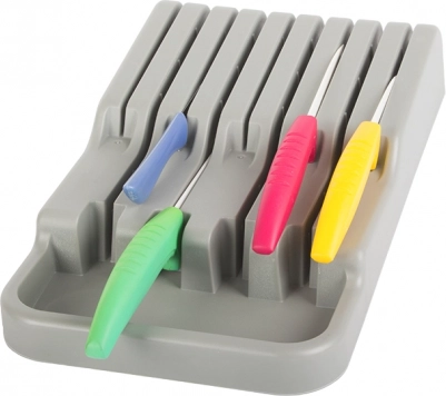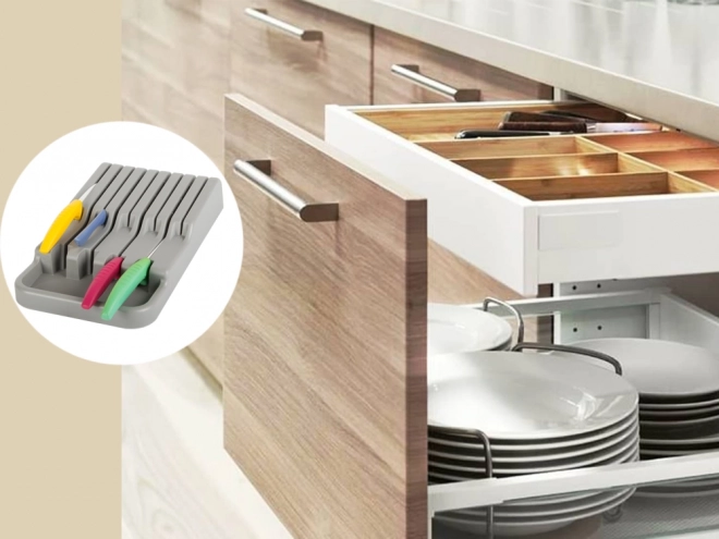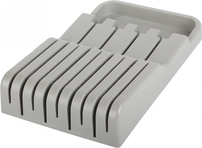 Elegante y funcional organizador para cuchillos que ayuda a mantener tu cocina ordenada y segura. Con 9 compartimentos, garantiza una disposición fácil y clara de los cuchillos en el cajón.