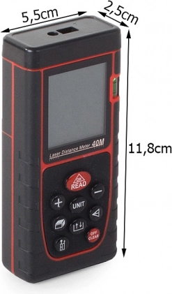 El telémetro láser digital está diseñado para mediciones precisas de distancia mediante tecnología láser. Su alcance máximo es de 40 metros, lo que lo convierte en un asistente ideal para medir grandes espacios como edificios, jardines o almacenes. El dispositivo es fácil de manejar y, gracias a sus dimensiones compactas, se guarda fácilmente en el bolsillo o en una funda.