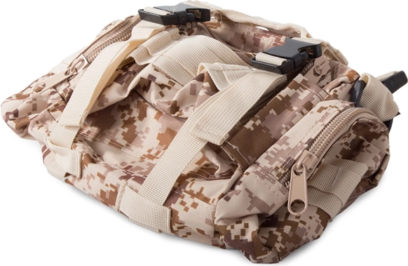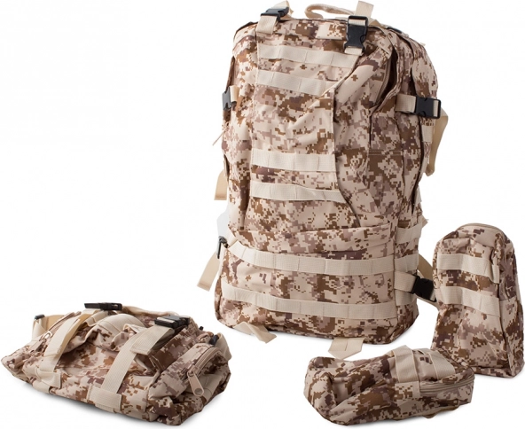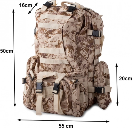 Emprende cualquier aventura sin preocuparte por el clima con esta mochila táctica impermeable. Ofrece un gran compartimento principal con otro bolsillo adicional y bolsillos de malla para una mejor organización. Dos bolsillos laterales se pueden desmontar fácilmente, mientras que la riñonera más grande puede usarse como bolsa independiente. La mochila utiliza el sistema MOLLE para añadir más bolsillos y módulos, y está equipada con cinturón de pecho y de cadera para máximo confort y estabilidad.