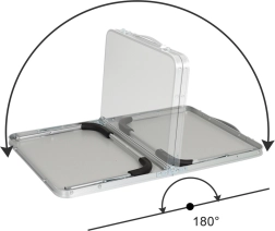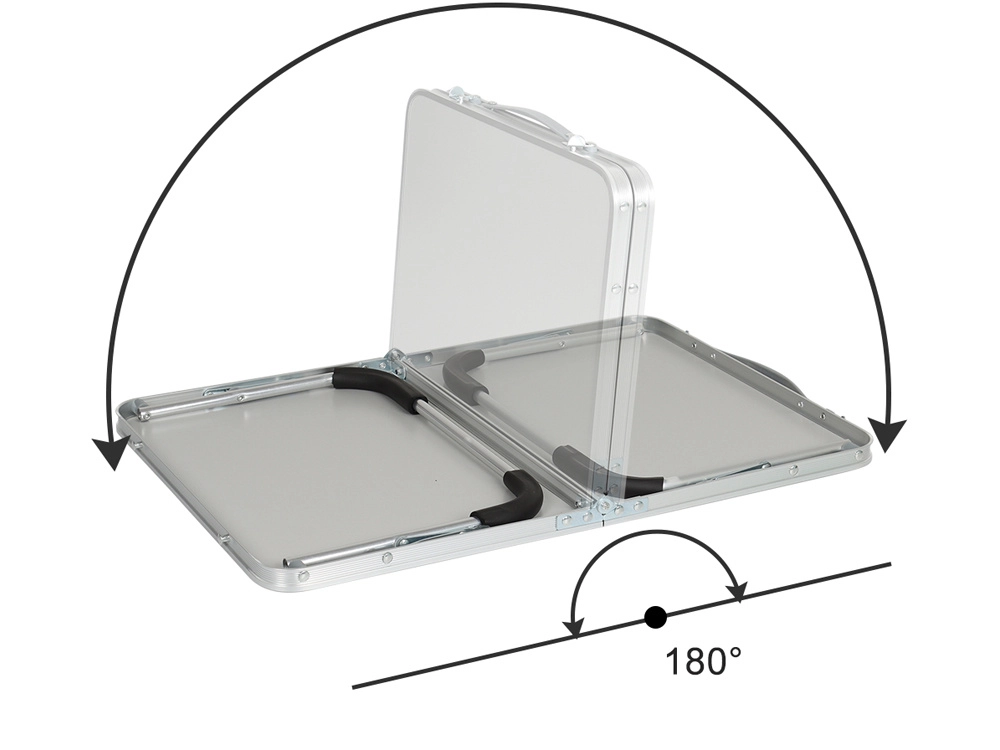 Las patas abatibles se aseguran con bisagras para evitar el plegado accidental. La mesa es segura tanto durante el uso como en el transporte.